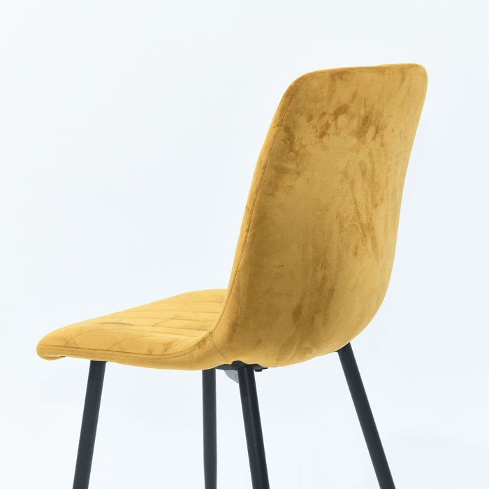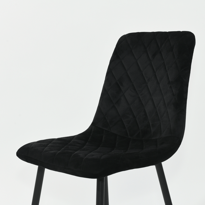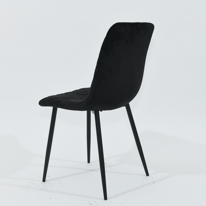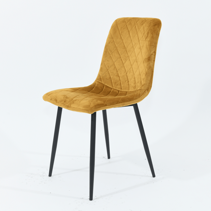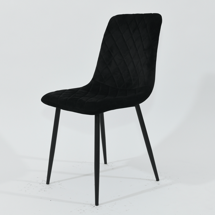 כיסא אוכל אלגנטי וסוחף בריפוד קטיפה רכה ונעימה למגע. מושב הכיסא מונח על רגלי מתכת מינימליסטיות ועדינות בצבע שחור צבוע בתנור לגימור אחיד ואטום.